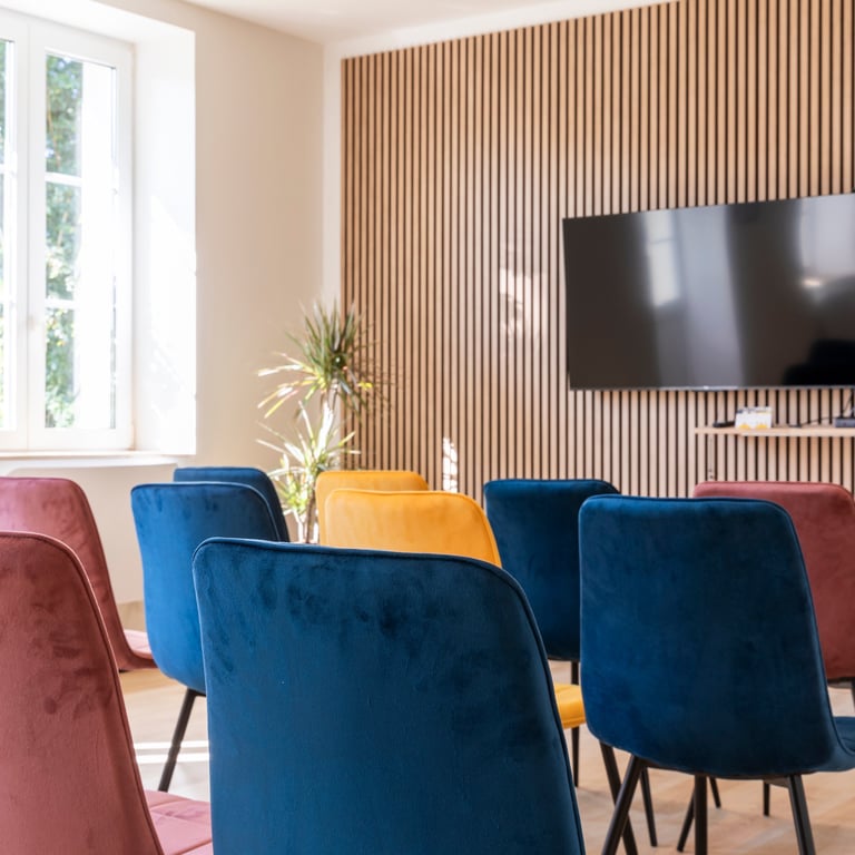 💡 Espace ouvert de 45 m²- vue sur le jardin - 2 TV LED 65’’ HD - Système de visioconférence intégré - Mur d'expression